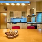V apartmánu je také kompletní kuchyně vybavená rychlovarnou konvicí, chladničkou a troubou.
